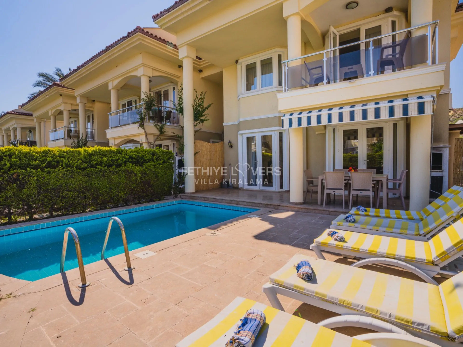 Offered with the privilege of Fethiye Lovers Villa Rental, this exclusive villa is located in one of Fethiye’s most popular holiday destinations, Çalış, close to the distinguished Çalış Plajı and in a seafront location. Situated within a residential complex, our villa combines luxury and comfort with its private swimming pool, private garden, and modern architecture.