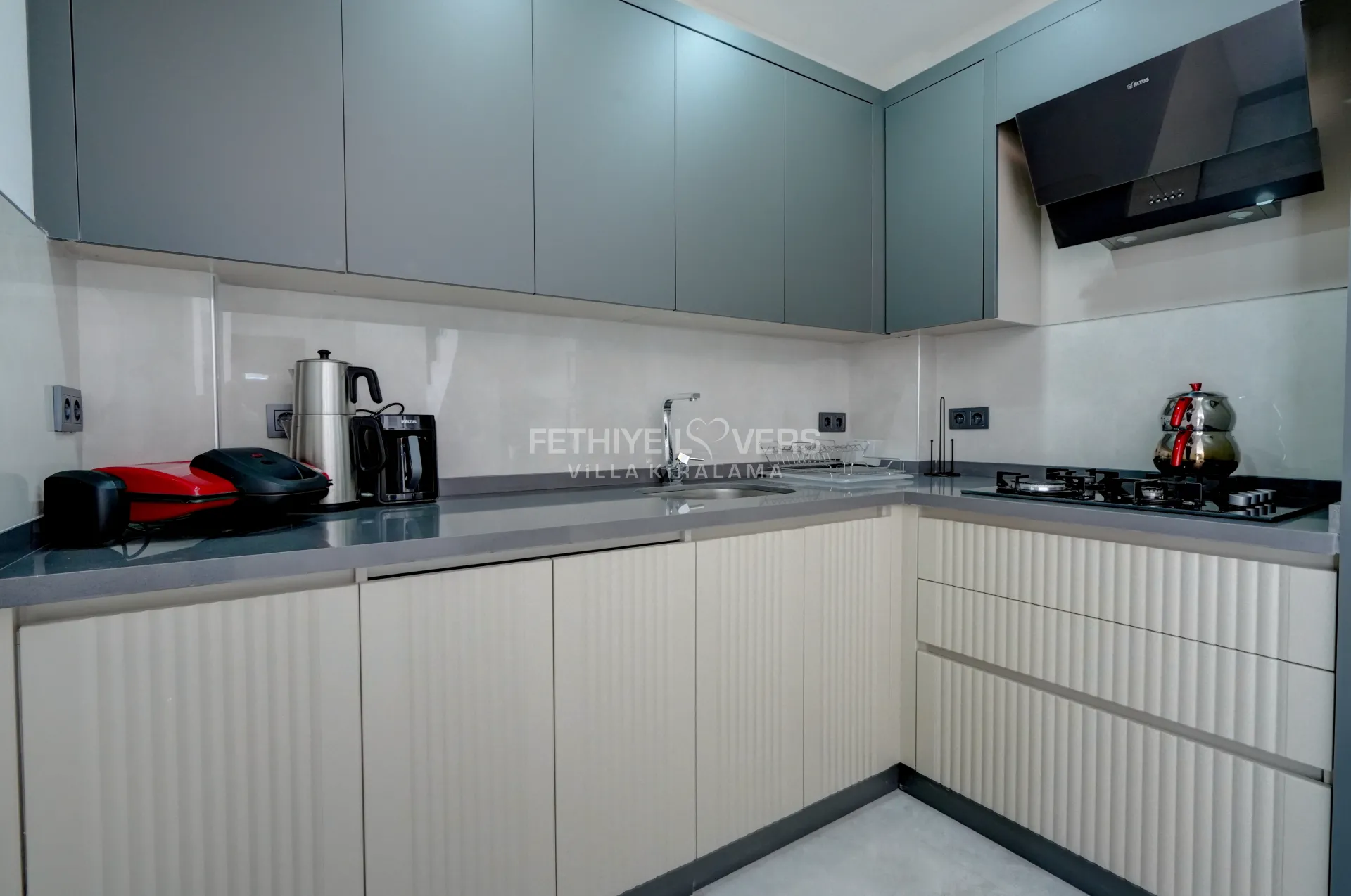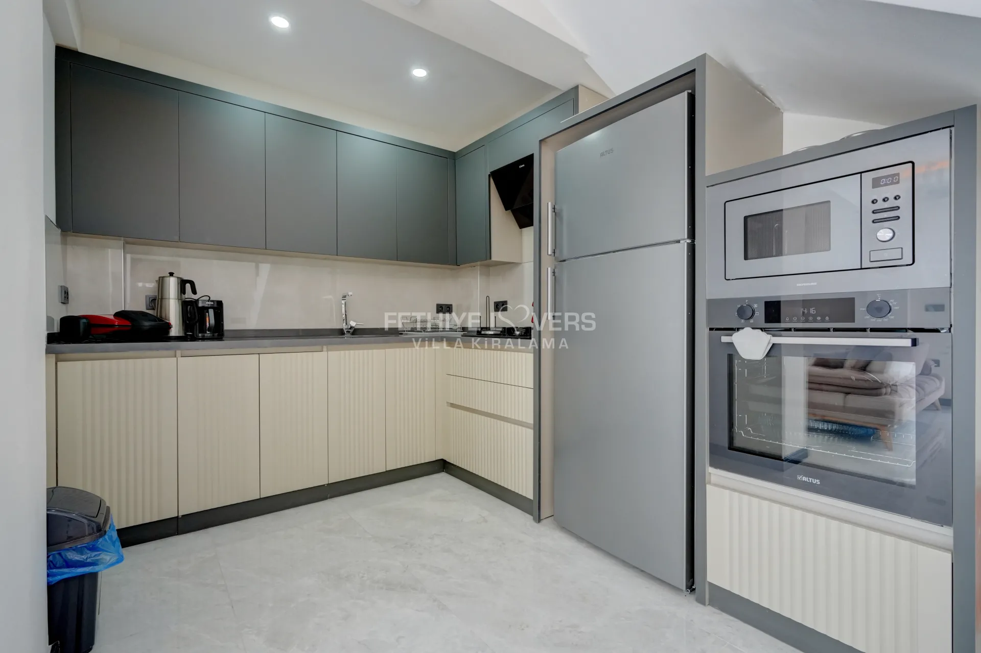 Mutfak : Tam donanımlı modern Amerikan mutfak içerisinde buzdolabı, bulaşık makinesi, fırın, Mikrodalga fırın tost makinası, ocak, elektrikli su ısıtıcı, yemek masası, yemek takımları, çatal ve bıçak takımları, tencere ve tava takımları ve bardaklar bulunmaktadır.