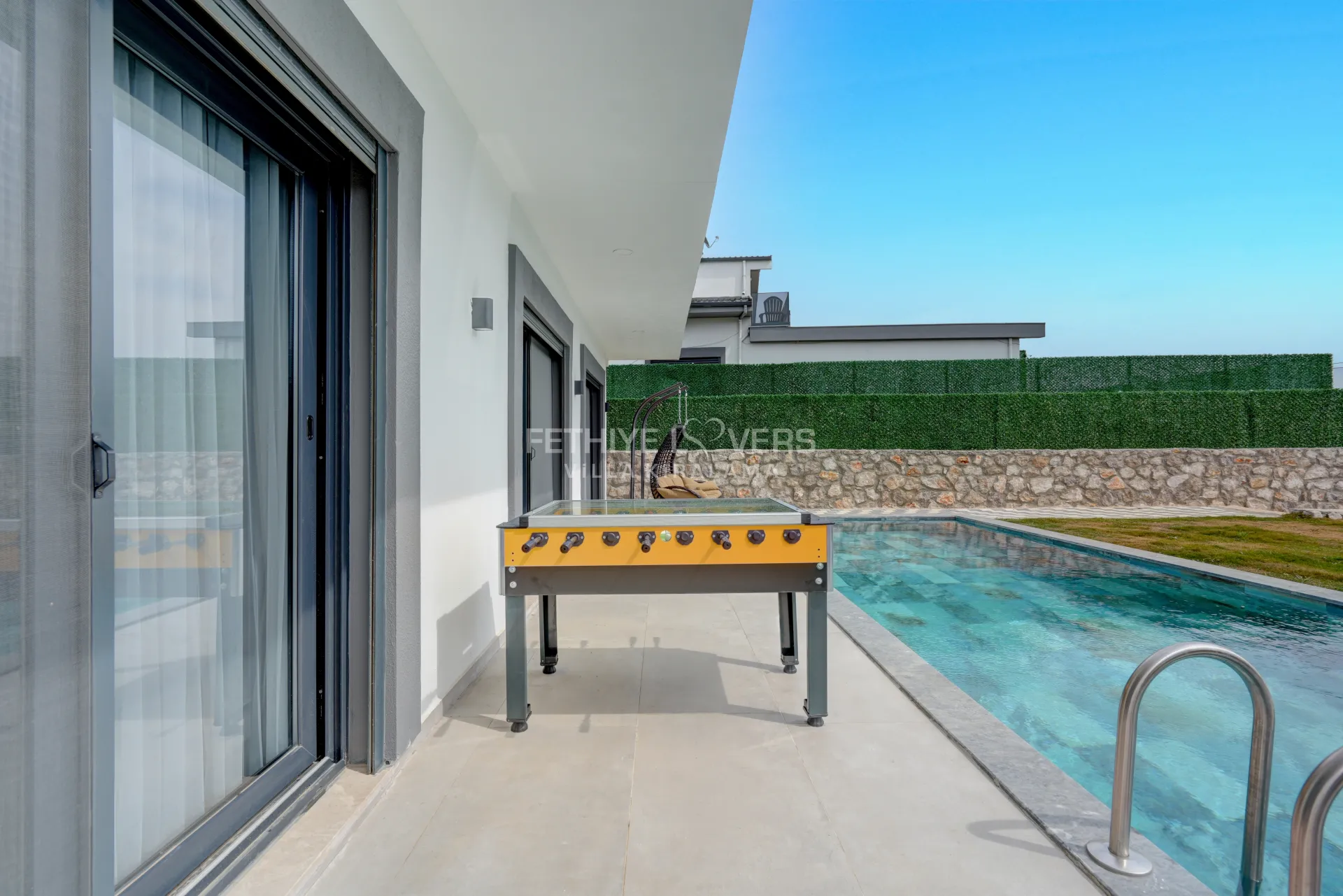 Salon : Konforunuz için tasarlanan manzaralı salonda oturma grubu, TV, klima, sehpa bulunmaktadır. Havuz terasına çıkış vardır.