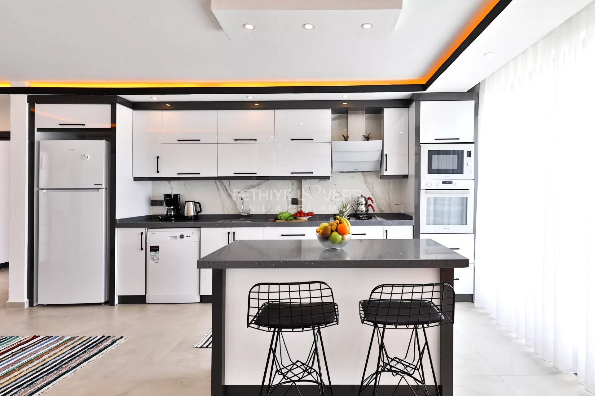 Mutfak: Tam donanımlı Modern Amerikan mutfağında, Buzdolabı, Bulaşık makinesi, Çamaşır makinesi, Mikrodalga fırın, elektrikli, su ısıtıcısı, 4’lü ocak, 10 kişilik yemek ve bardak takımı bulunmaktadır.