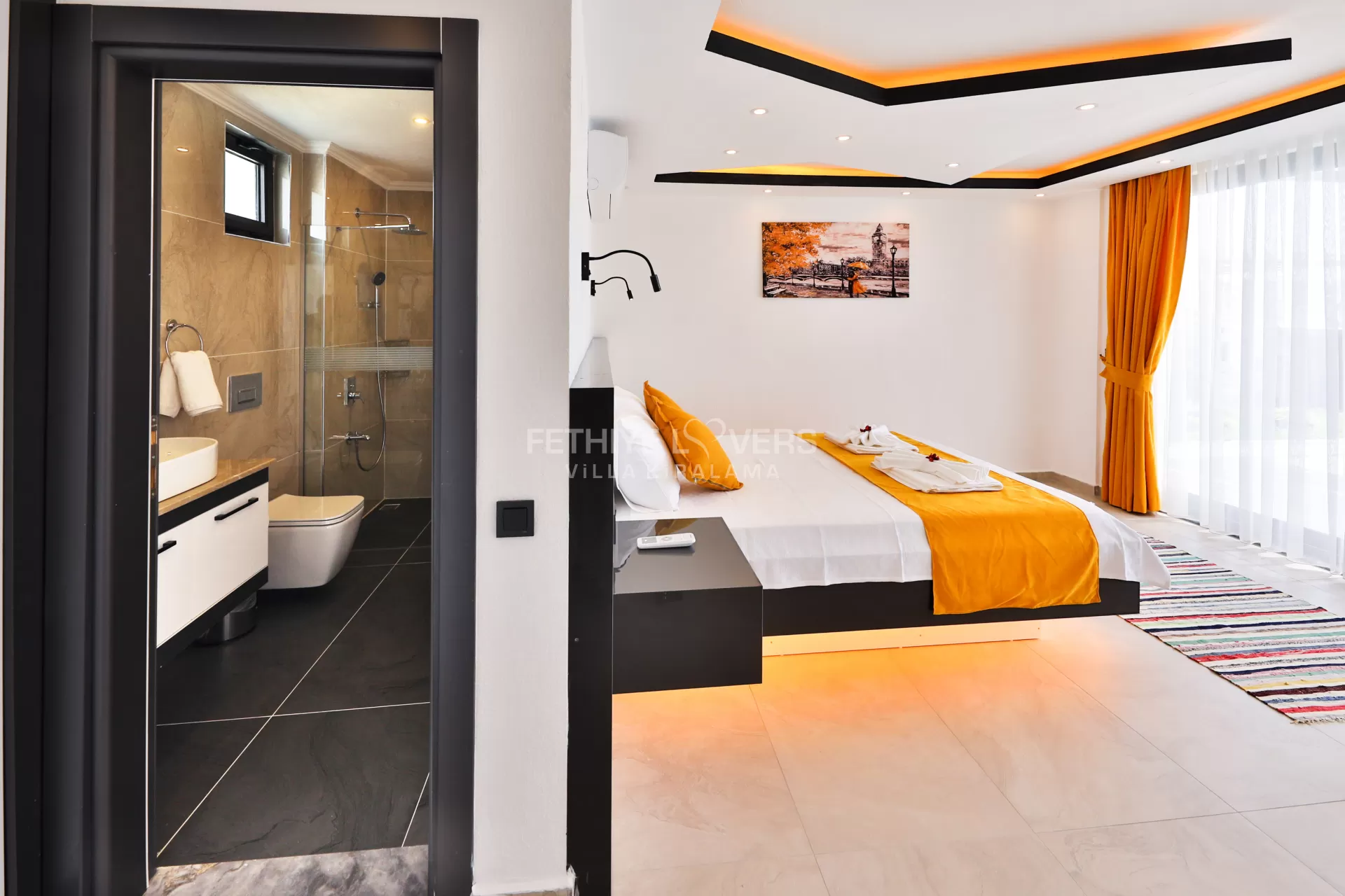 5. Yatak Odası: Bir adet çift kişilik yatak, elbise dolabı, komodin, makyaj masası, klima ve jakuzi yer almaktadır. Özel banyo ve tuvalet bulunmaktadır.