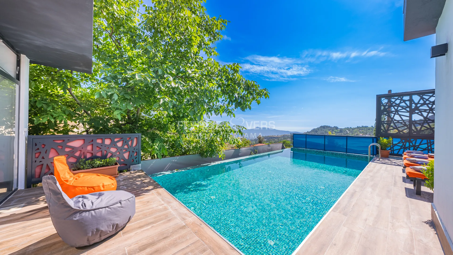Salon : Konforunuz için tasarlanan manzaralı salonda oturma grubu, TV ve özel tasarım TV ünitesi, klima, sehpa, bulunmaktadır. Havuz terasına çıkış vardır.