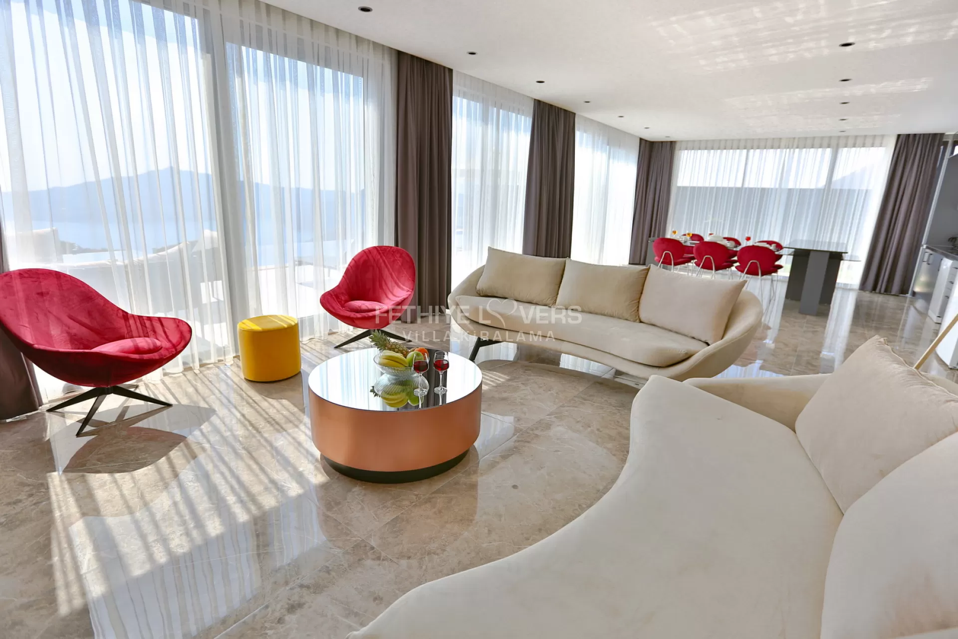 Salon : Konforunuz için tasarlanan manzaralı salonda oturma grubu, TV, klima, sehpa bulunmaktadır. Havuz terasına çıkış vardır.